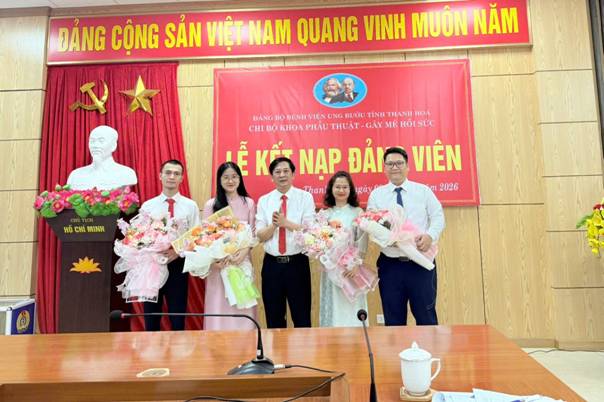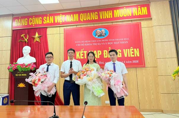 Từ ngày 1/4/2026 đến ngày 9/4/2026, Các chi bộ trực thuộc Đảng bộ Bệnh viện Ung bướu tỉnh Thanh Hóa long trọng tổ chức lễ kết nạp Đảng viên mới cho các quần chúng ưu tú thuộc các chi bộ: Lê Thị Thanh, Nguyễn Thị Huyền, Chi bộ Liên Khoa Cấp cứu hồi sức - Điều trị tích cực ; Nguyễn Khánh Linh thuộc Chi bộ Khoa Khám bệnh; Phạm Thùy Trang thuộc Chi bộ Khoa Khoa CĐHA &TDCN; Lê Thị Huệ, Lê Ngọc Vũ thuộc Chi bộ Khoa Huyết học - Sinh hóa- Vi sinh; Lê Trần Vân Anh, Tô Thị Xuân, Trịnh Thị Trang thuộc Chi bộ Phòng Tài chính kế toán; Lê Mạnh Trường, Nguyễn Thị Trang, Trần Cường Mạnh thuộc Chi bộ Khoa Trị xạ & Y học hạt nhân; Nguyễn Ngọc Dương, Trịnh Thị Trinh, Cao Thanh Xuân, Nguyễn Hữu Khoa thuộc Chi bộ Khoa Phẫu Thuật- Gây mê hồi sức.